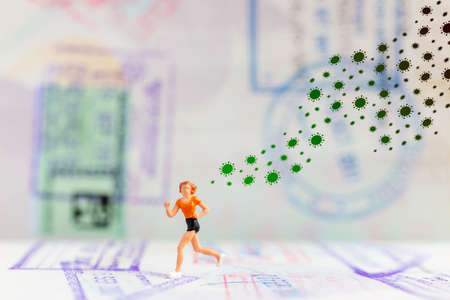 Corona virus global pandemic concept. Miniature man standing near big Corona virus novel in dark. Creative decoration with fog and backlight. Selective focus