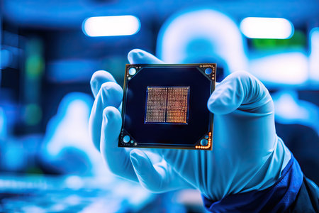 production of central processing units, gloved hand holds a cpu