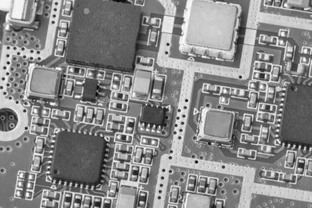 Electronic circuit board close up. Limited depth of field. Black and white image Background