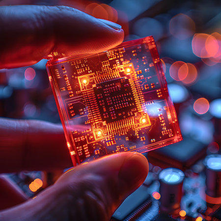 Gloved hand of contemporary technician of African ethnicity showing microchip while holding it in front of camera