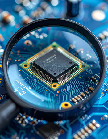 Close-up of electronic circuit board with magnifying glass. Technology background