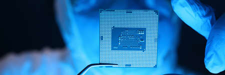 Man in uniform holds microprocessor with forceps. Repair microprocessor electronics electrical equipment. Dust protection at enterprise for creation electronic devices. Chemical elements in design