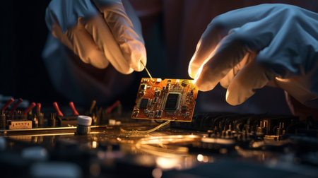 Work with a soldering iron Microelectronics device Closeup hands of a service worker repairing modern smartphone Repair and service concept : Generative AI