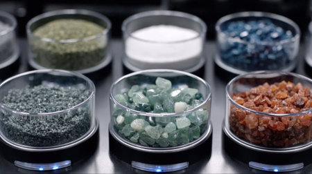 Colorful crystals in petri dish on dark background. Selective focus.