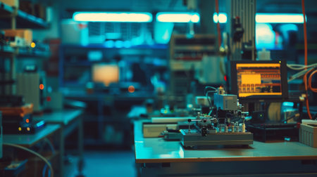 An electronic circuit board and various components are showcased, illuminated by a combination of red and blue light. The image highlights a complex arrangement of wires, panels, and equipment, indicating a possible laboratory or workshop setting. This composition may be suitable for illustrating technology, innovation, or research concepts in commercial contexts.