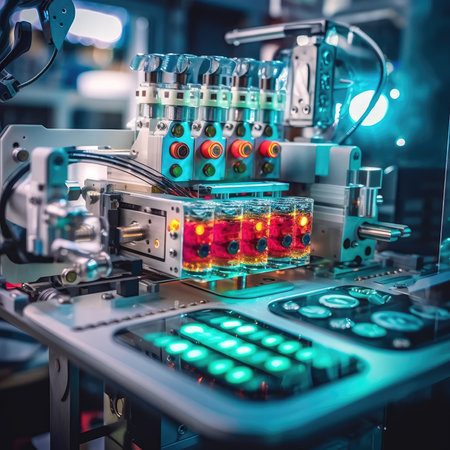 Robotic arms equipped with syringes precise various colored buttons in a modern lab setting, showcasing technology in action during testing procedures.