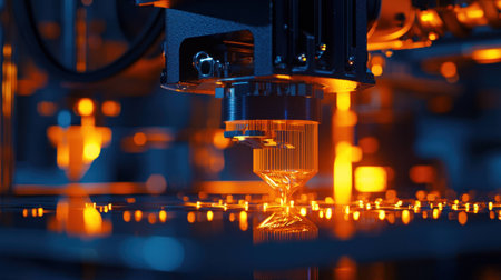 Modern engineering excellence in high-precision mechanical component printing under neon lights. concept of advanced manufacturing, futuristic innovation, precision technology, industrial design.