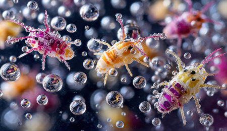 Microscopic, vibrant insects suspended in water bubbles, refracting light and detailed