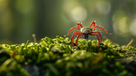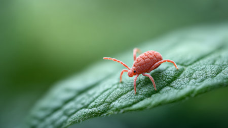 Extreme close up of an orange mite crawling on a vibrant green leaf, showcasing the intricate details of the tiny creature and its natural environment