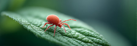 Extreme close up of a red velvet mite exploring the textured surface of a vibrant green leaf, showcasing the intricate details of the natural world