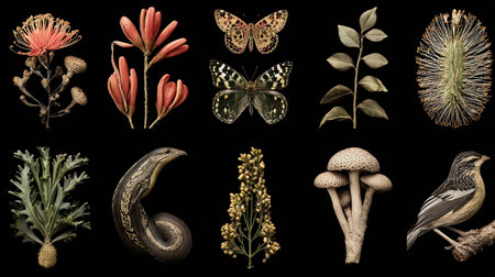 Collection of different flowers and insects isolated on black background. High quality photo