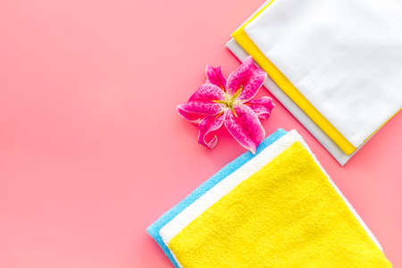 Clean towels gray, orange, lilac, white on a pink background. Place for text.