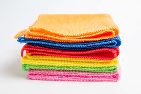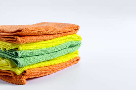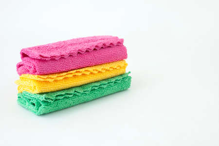 colored cloth cleaning towels close up on a white background stack of towels