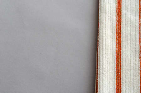 White Bath Towel on Gray Background. Soft Towel with vertical red line. selective focus.