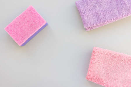 Pink and purple sponge and microfiber cloth for cleaning and dusting on gray background. Accessories for cleaning kitchen and home concept. Top view, copy space
