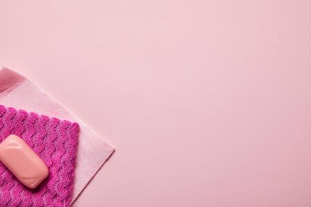 top view of pink rags and soap on pink background