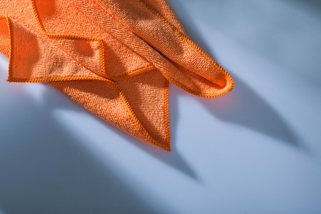 Woman's hand holding orange microfiber cloth against orange background