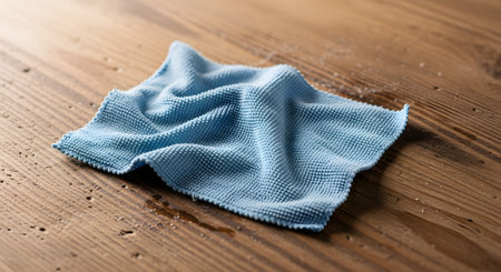 A crumpled blue microfiber cleaning cloth rests on a textured wooden surface. The image highlights the fabric's texture and is suitable for themes related to hygiene, housekeeping, dusting, or cleaning supplies.