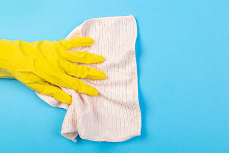 a hand in a yellow rubber cleaning glove holds a dry rag on a blue background. Part of the body stick out of the hole in the paper, banner