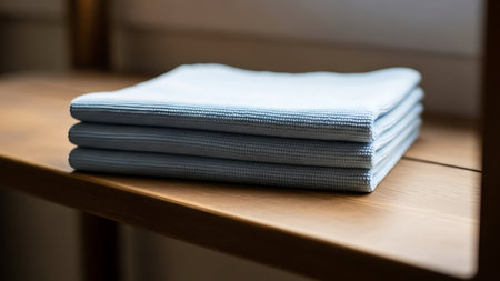 The image shows a neatly folded stack of blue and white cloths placed on a wooden surface. The cloths appear to be made of a textured fabric, possibly for cleaning or kitchen use. The background is blurred, focusing attention on the stack of cloths.