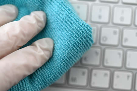 Close up view of hand with protective glove wiping a computer keyboard.