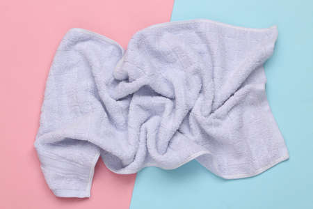 Purple towel on pink blue background. top view. top view