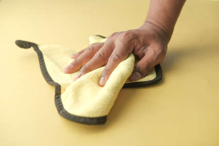 close up of person hand cleaning table with cloth