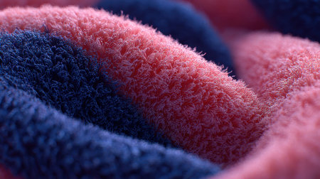 Textured fabric displays a mix of vibrant pink and blue, revealing soft fibers that create a cozy and inviting appearance, perfect for relaxation.