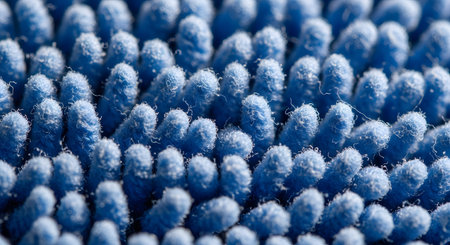 A top-down, extreme macro photograph captures the dense and plush texture of a vibrant blue shag carpet. The thick, soft fibers of the rug create a cozy and inviting abstract background. This detailed image is perfect for showcasing textiles, home decor, and comfortable materials.