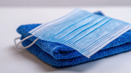 A mask is resting on a folded cloth in a clean area with some disarray in the surroundings.