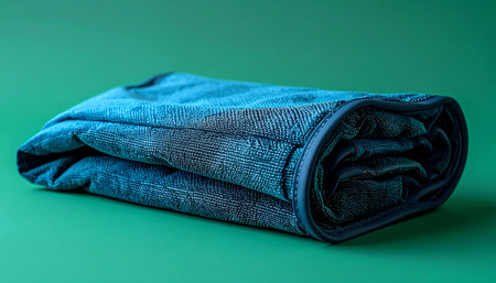 A freshly laundered blue terrycloth towel, neatly folded and resting on a vibrant green surface. This minimalist composition evokes a sense of cleanliness, comfort, and the simple pleasures of a spa day at home or a well-organized linen closet.
