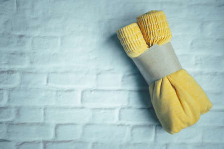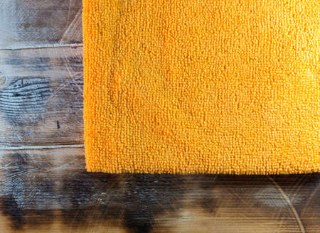 Microfiber cloth on yellow background, top view. Spring cleaning and household concept. Advertising space with copy space, flat lay.