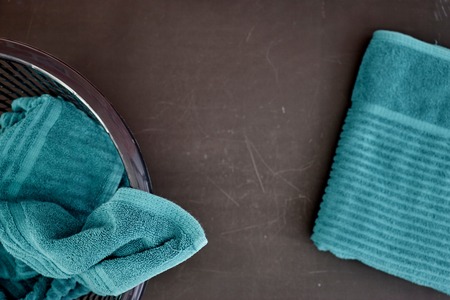 Bathroom towel in basket on table. navy blue wall background