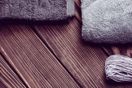 Bath towels on wooden background. Blue bath towel
