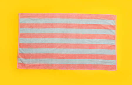 Striped beach towel on yellow background, top view