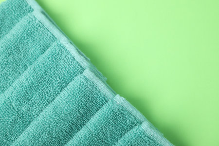 Turquoise terry towel on green background, top view. Space for text