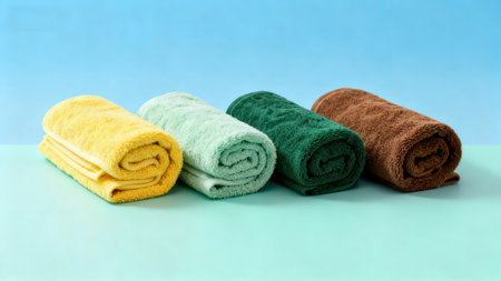 Colorful towels on a blue and green background with copy space.