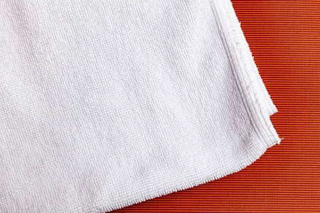 White Bath Towel on Gray Background. Soft Towel with vertical red line. selective focus.