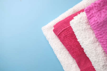 Fresh towels on a colored background with place for text top view.