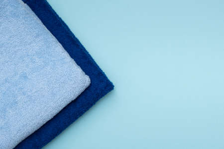 Two new folded microfiber cloth for cleaning on blue background. Cleaning micro fabric towels for dusting and polishing. Domestic household cleaning service concept. Close up, copy space