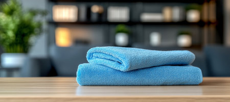 Soft Terry Cloth Neatly Folded on a Polished Wood Surface, Ideal for Cleaning and Home Organization