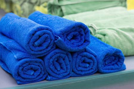 pile of rolled folded blue towel in spa resort