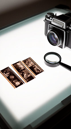 Vintage camera and film negatives on lightbox. That the image is generated using AI.