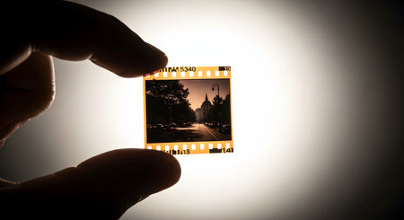 A person's silhouetted hand holds a single 35mm film negative up to a bright light, revealing the image of a city street. This image symbolizes analog photography, memories, the developing process, and a love for classic picture-taking.