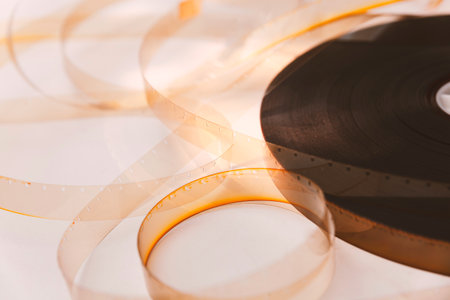 Close-up of a vintage film reel with an unwound strip of classic film, emphasizing the artistry and texture, evoking nostalgia and the history of cinema.