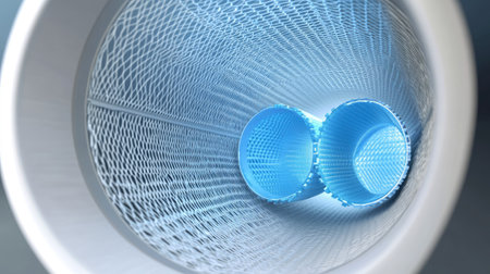 Sleek black and white cylindrical filters with pleated textures rest on a gentle gray backdrop, symbolizing modern solutions for pure, breathable environments.