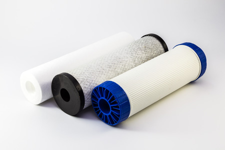 Filter cartridges for house water filtration system on white background. Foamed polypropylene, granular and briquettes carbon cartridges. Installation of reverse osmosis water purification system