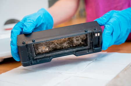 Man hand holding modern vacuum cleaner hepa filter in hand full with dust black with microbes and allergies
