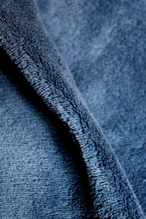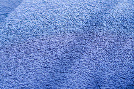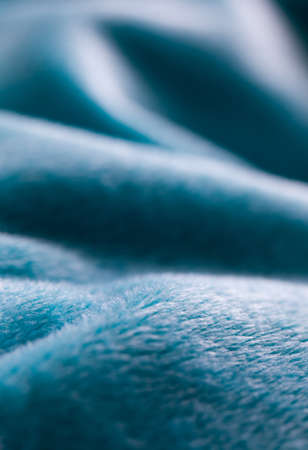 Blue delicate soft background of fur plush smooth fabric. Texture of fleecy blanket textile. Faux fur textile background. Selective focus.