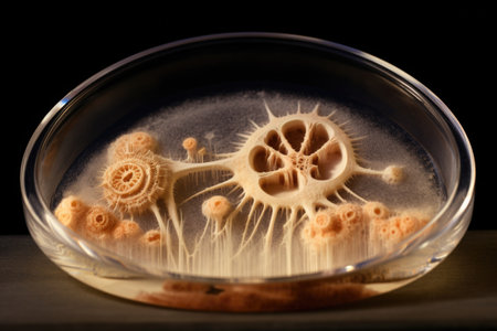 Microscopic view of intricate branching structures inside a petri dish, showcasing a captivating biological composition.